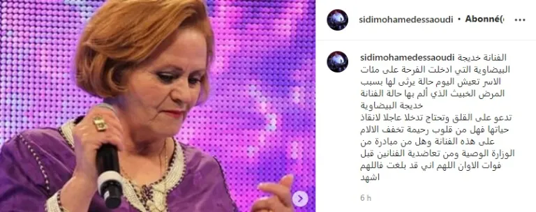 واضاف السعودي ، “حالة الفنانة خديجة البيضاوية تدعو على القلق وتحتاج تدخلا عاجلا لانقاذ حياتها فهل من قلوب رحيمة تخفف الالام على هذه الفنانة”.