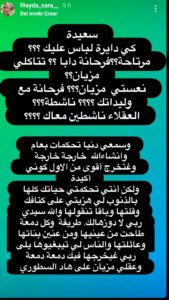 و أضافت المتحدثة :” وسمعي دنيا تحكمات بعام و انشاء الله خارجة خارجة و غتخرج أقوى من الأول  كوني أكيدة ، و لكن انتي تحكمتي حياتك كلها بالذنوب لي هزيتي على كتافك ، و قلتها و باقا تنقولها و الله سيدي ربي لا دوزها ليك طريفة “.