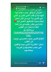 و في سياق منفصل ، ضرب ايهاب أمير موعدا مع جمهوره من خلال نفس الستوري ، معلنا حلوله ضيفا ببرنامج “احكي مع شهرزاد” للاعلامية المغربية شهرزاد عكرود و كتب ” غتفتح قلبي حيت معمرني دويت كن القلب”.