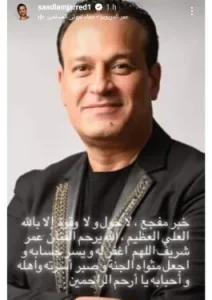 ونشر لمجرد صورة الفنان الراحل عمر شريف الشريف عبر خاصية الستوري على حسابه الرسمي بموقع تبادل الصور والفيديوهات أنستغرام، علق عليها قائلا “خبر مفجع، لا حول ولا قوة إلا بالله العلي العظيم، الله يرحم الفنان عمر الشريف، اللهم اغفر له ويسر حسابه واحعل مثواه الجنة وصبر أسرته وأهله واأحبابه يا أرحم الراحمين”.