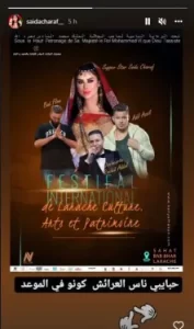 نشرت الفنانة المغربية الصحراوية سعيدة شرف، بوسط اعلان ترويجي لمهرجان العرائش والذي انطلقت فعالياته يوم الاثنين وستسمر إلى غاية 30 من شهر يوليوز الجاري.